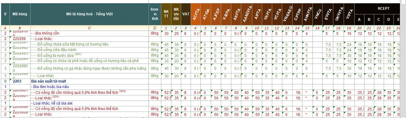 II. Thuế nhập khẩu bia :